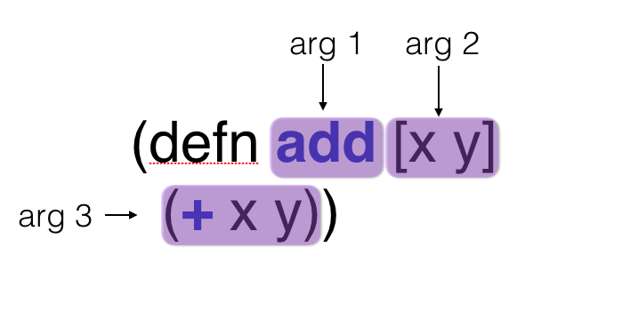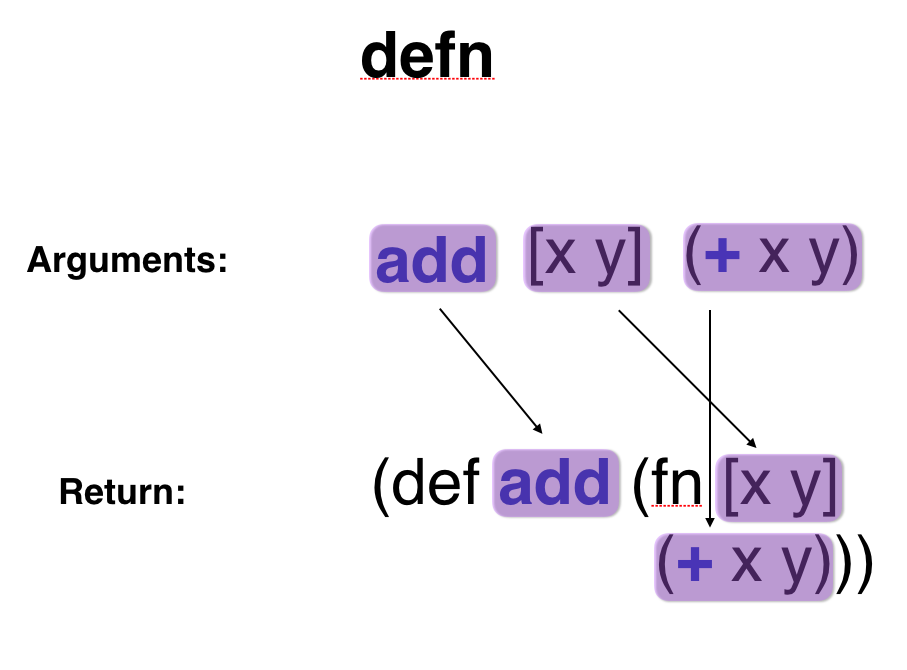 familiar functions along with their (pseudo) types for comparison. map takes an array as its input, and returns another array. sum takes an array as input, and returns a number. defn takes code input and returns more code.